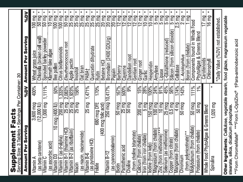 Whole-food ingredients: spirulina, chlorella, wheatgrass, ginger, garlic
